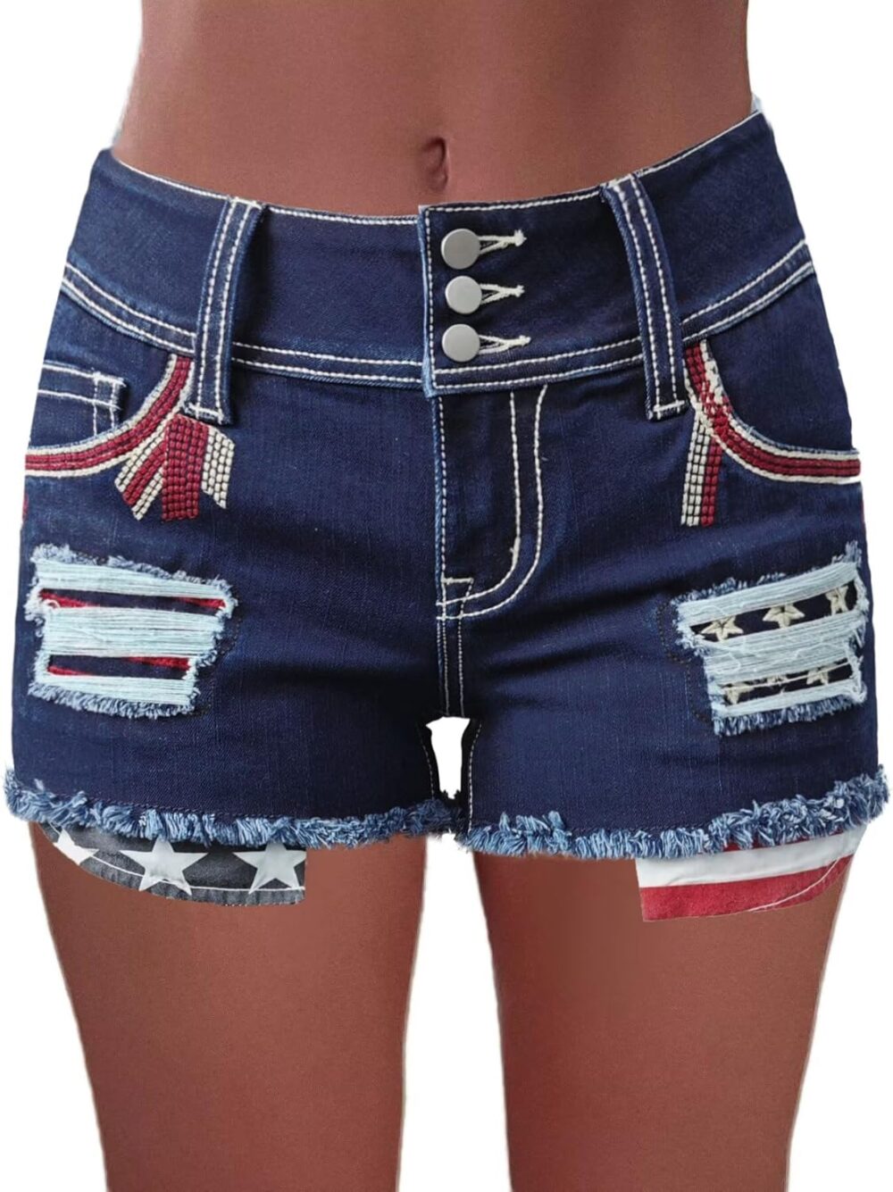 Women High Waist American Flag Button Fly Raw Hem Denim Shorts
